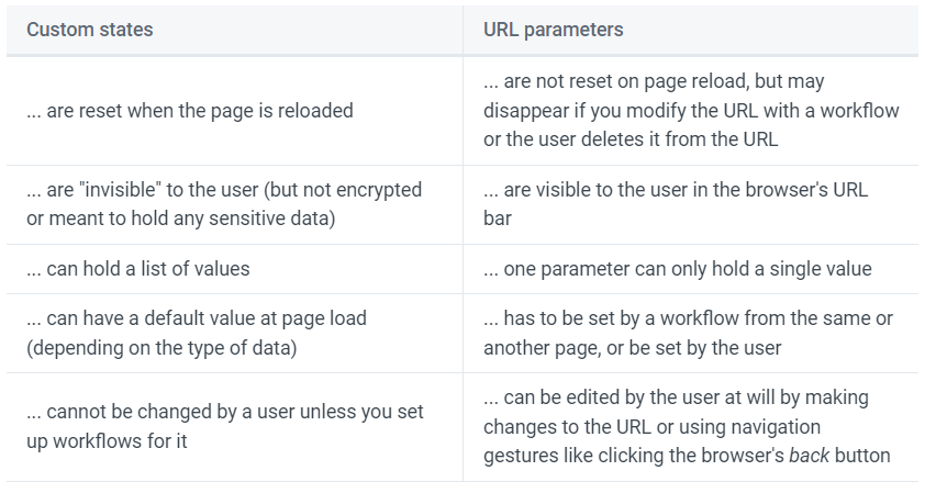 I like to use the analogy of a bucket to describe a custom state. You can temporarily store data in the 'bucket', and throw it out once the page is reloaded. This can be useful if you are doing calculations or creating a temporary list to load in a repeating group.